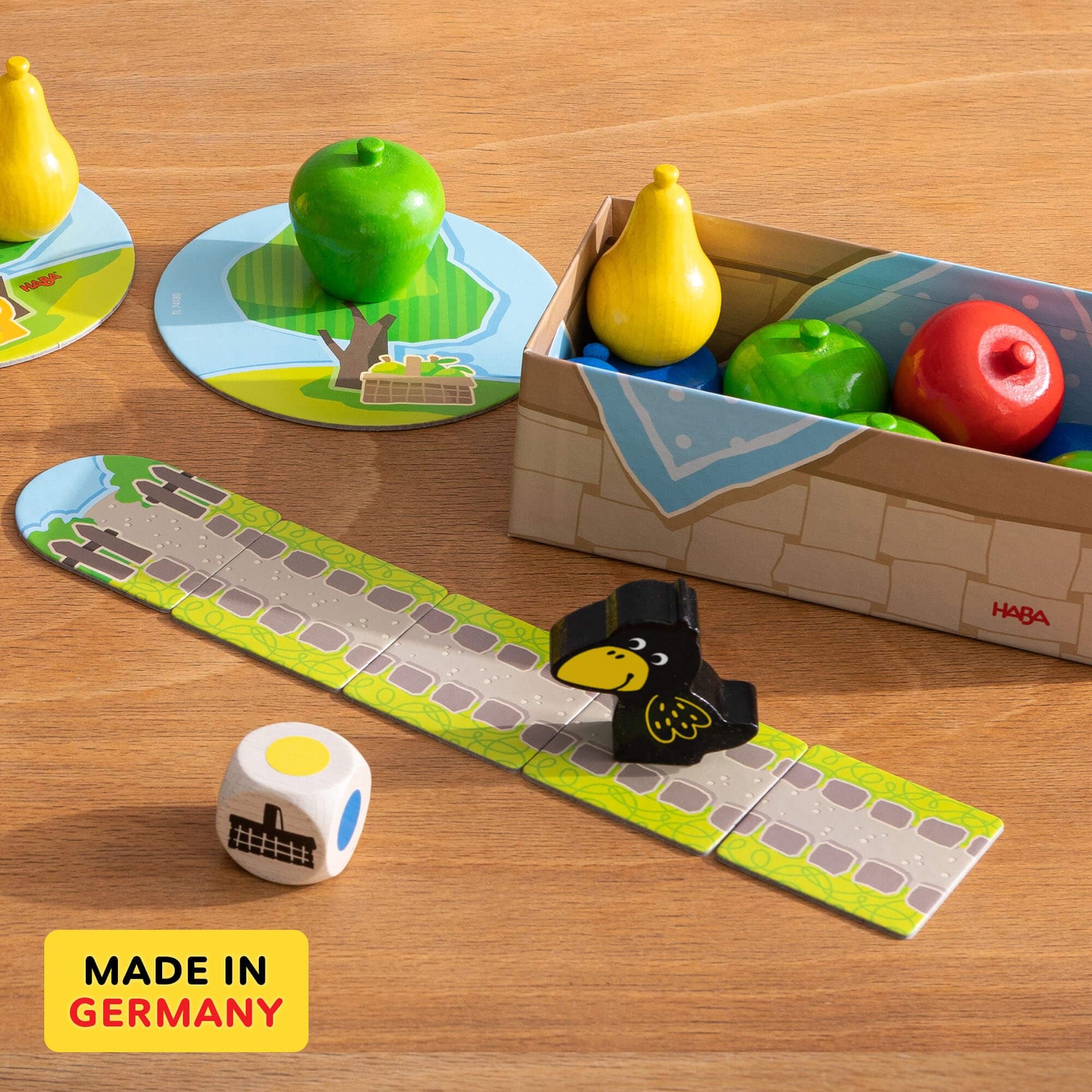 Open up the sturdy box to find: 16 large wooden fruit pieces (4 green apples, 4 red apples, 4 yellow pears, 4 blue plums), a chunky color die, a wooden raven, 5 path cards, and 4 trees.